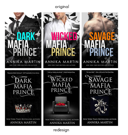 I loved the dramatic eye-catching original covers, so I was shocked when I was scrolling Kindle and saw the darker covers. The new covers remind me of the “object cover” trend that was popular with erotic romance in the mid-2010s. I think the new covers signify the darker and less conventional structure of these mafia romances. That said…the last one gives me some George R.R Martin vibes